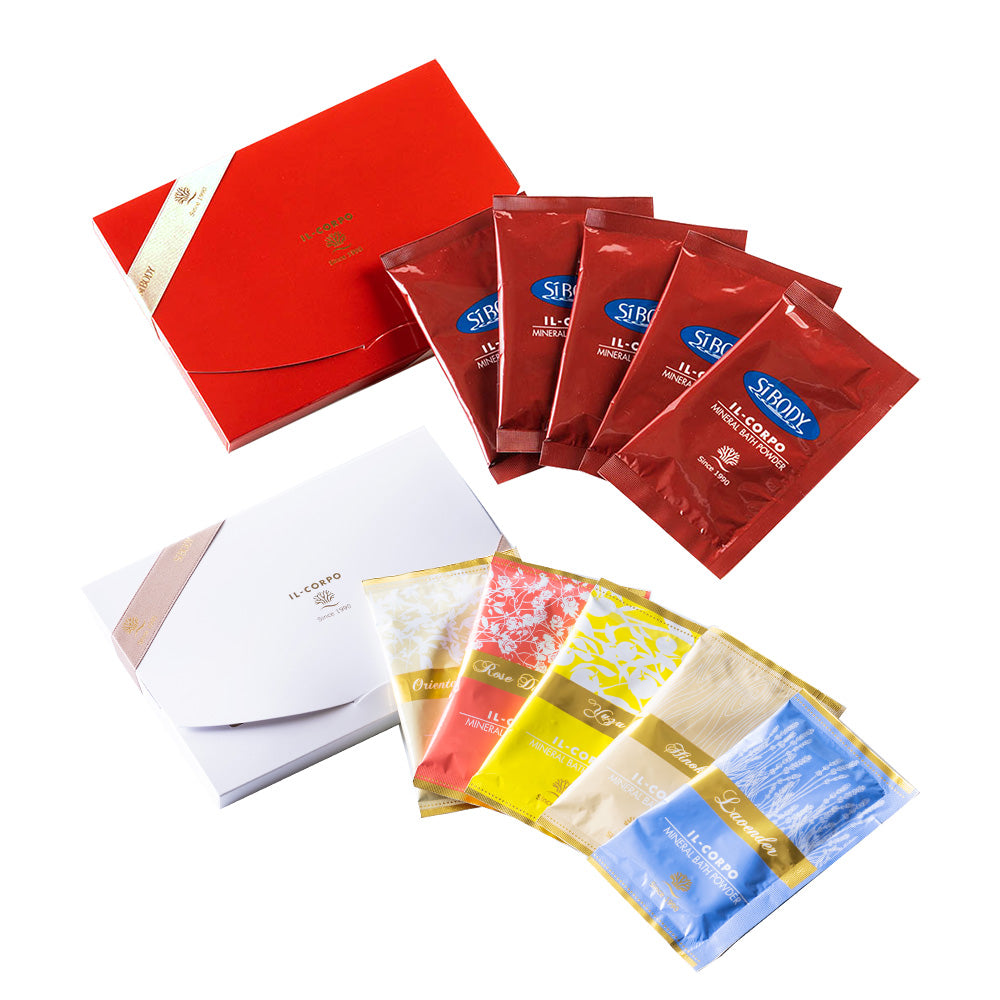 シックで艶やかなマルーンカラーを基調とした大人向けのギフトケース入り。イルコルポのミネラルバスパウダー5包をそのまま贈れるギフトパッケージにしました。大切な人、ご友人へのちょっとしたプレゼントや手土産におすすめです。