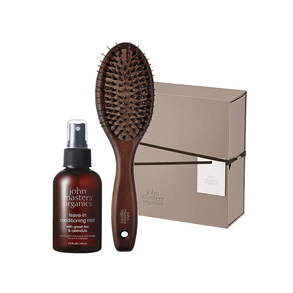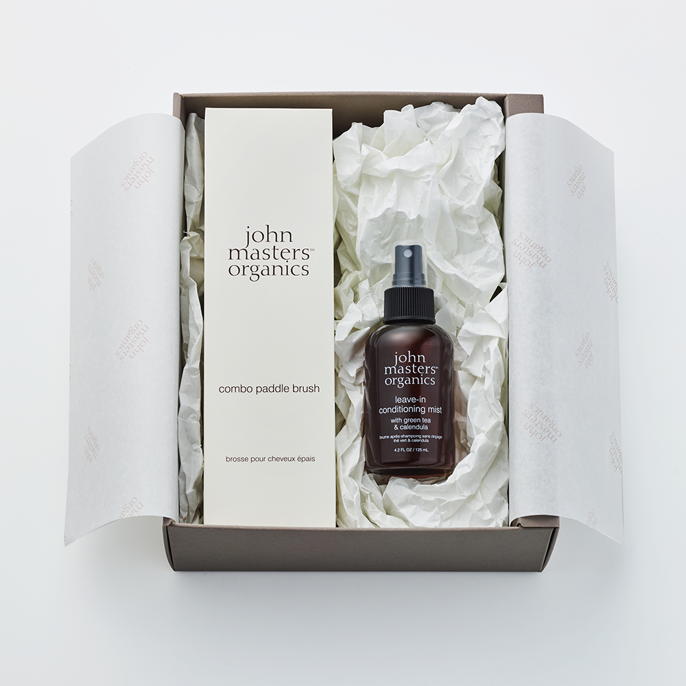 乾燥する季節も、スプレーしてブラシでなじませるだけで、シルクのようなサラツヤ髪が叶う〈G&Cリーブインコンディショニングミスト N〉と髪にまとまりとツヤを与える〈コンボパドルブラシ〉のギフト。