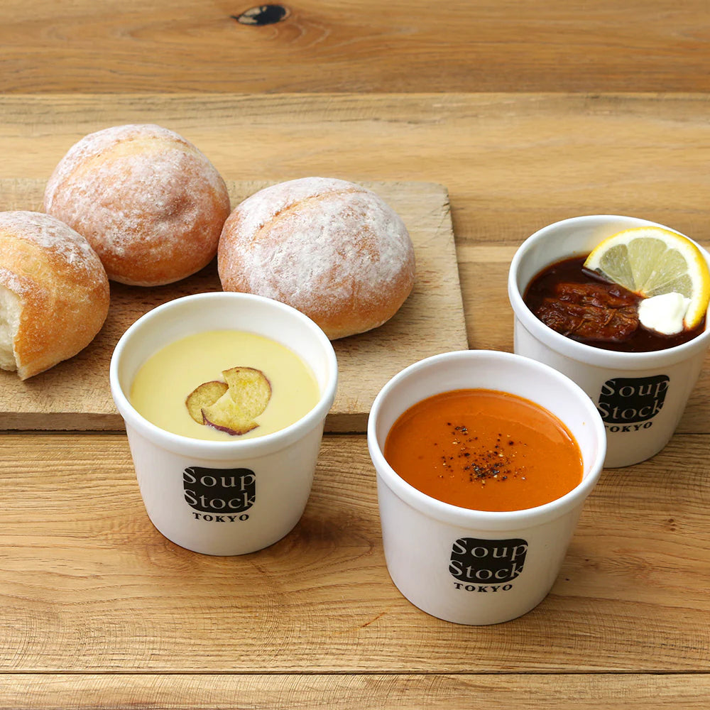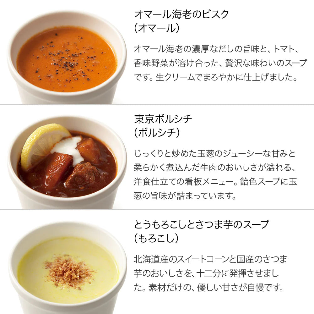 当店の看板メニュー「オマール海老のビスク」をはじめとした人気のスープと、石窯オーブンで焼き上げた、スープと相性のよいパンを合わせてご用意しました。