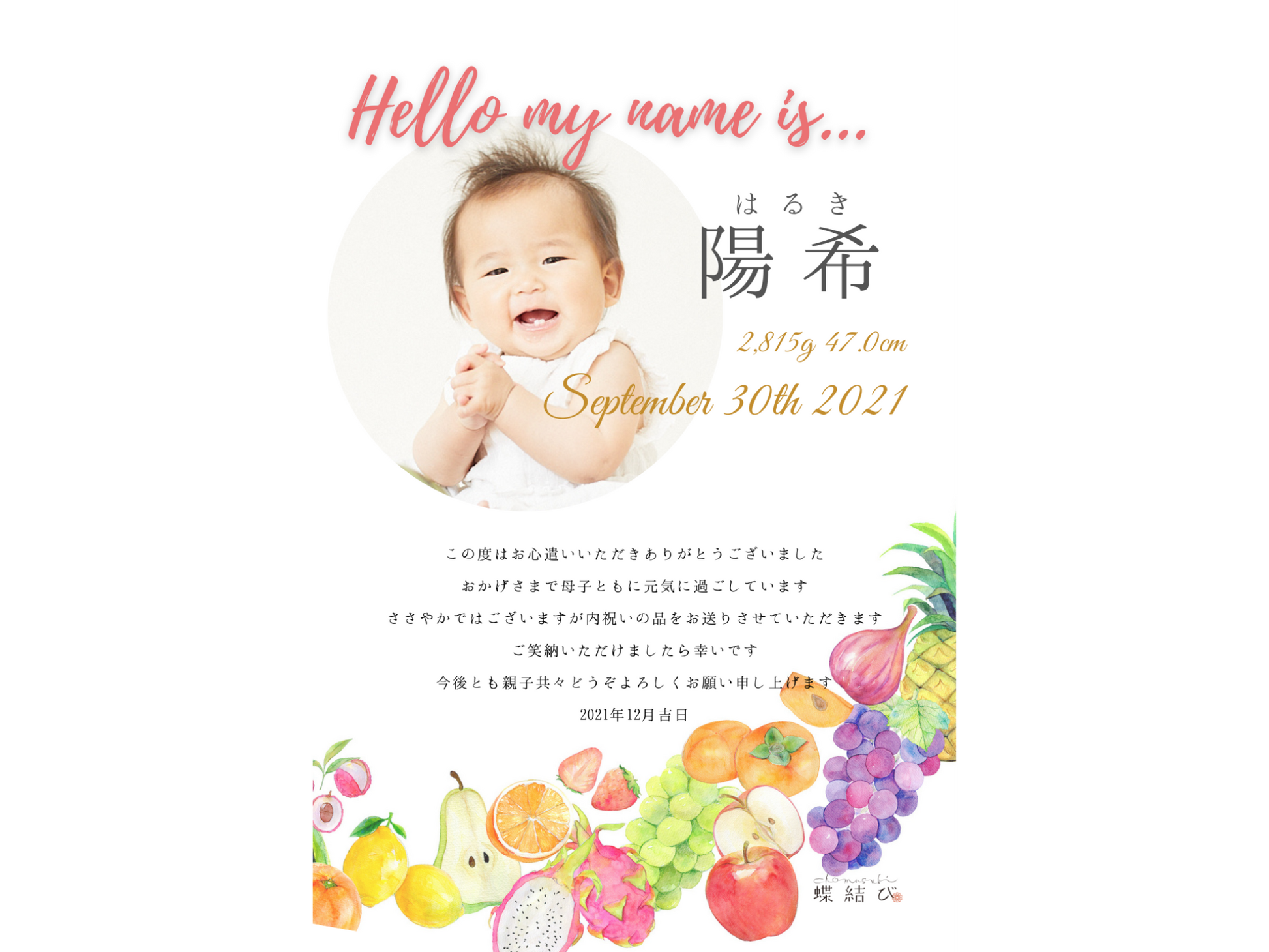 出産祝いのお返しにお子様のお写真をお入れいたします。お名前と合わせてお誕生日、出生時体重、身長もお入れすることができます。