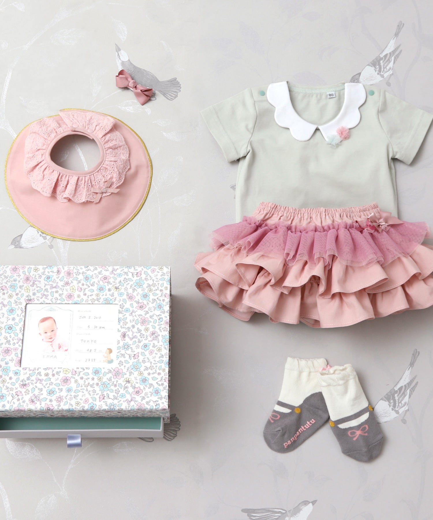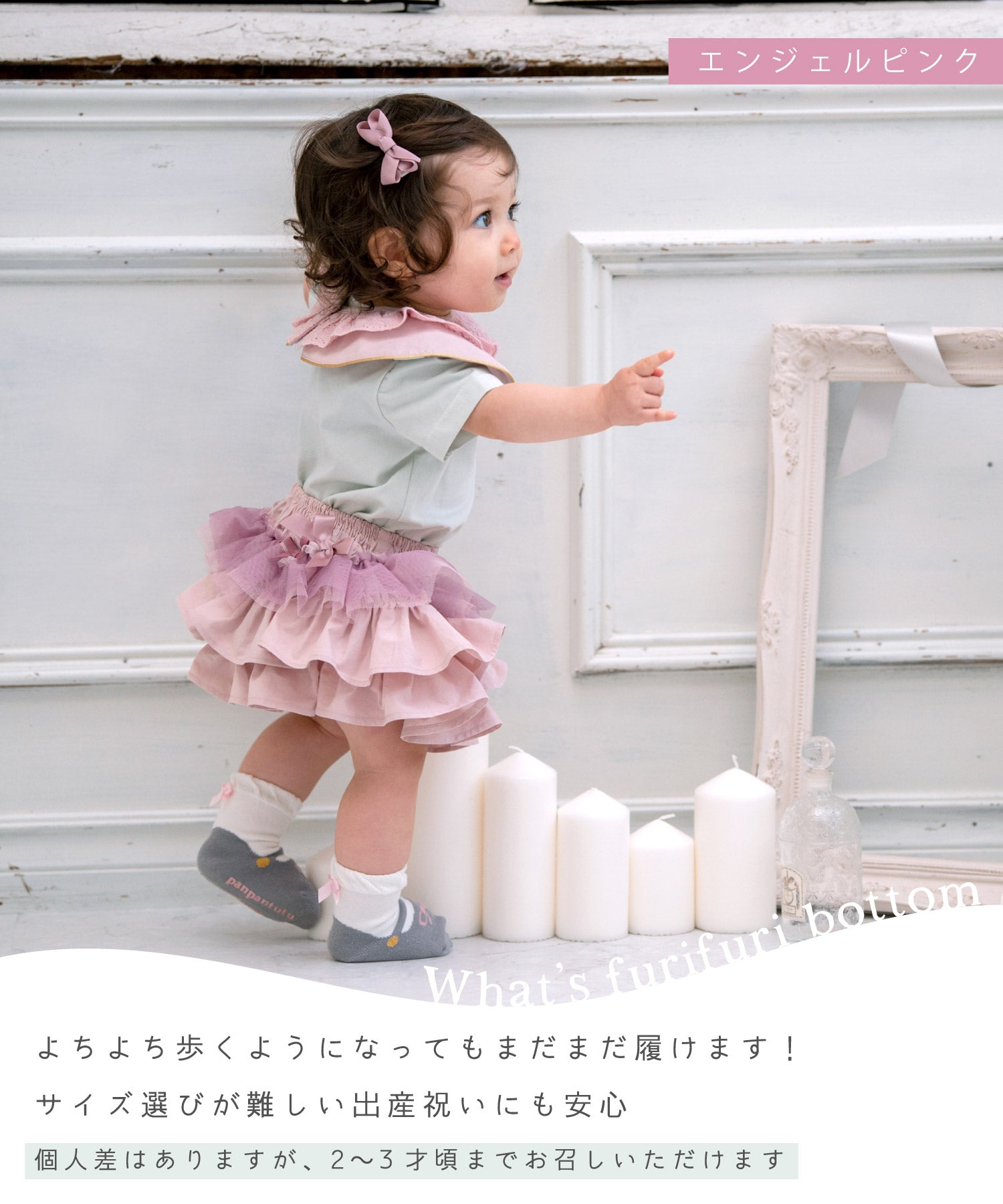 天使のようなえりがポイントになったロンパース。ビブ、フリフリボトムはベビーから2歳頃の長い月齢で着用できます。靴を履いているようなソックスもセット。仕上げのリボンヘアピンをつけたらスウィートコーデの完成!着回しで普段使いはもちろん、セットアップ風で特別な日に。