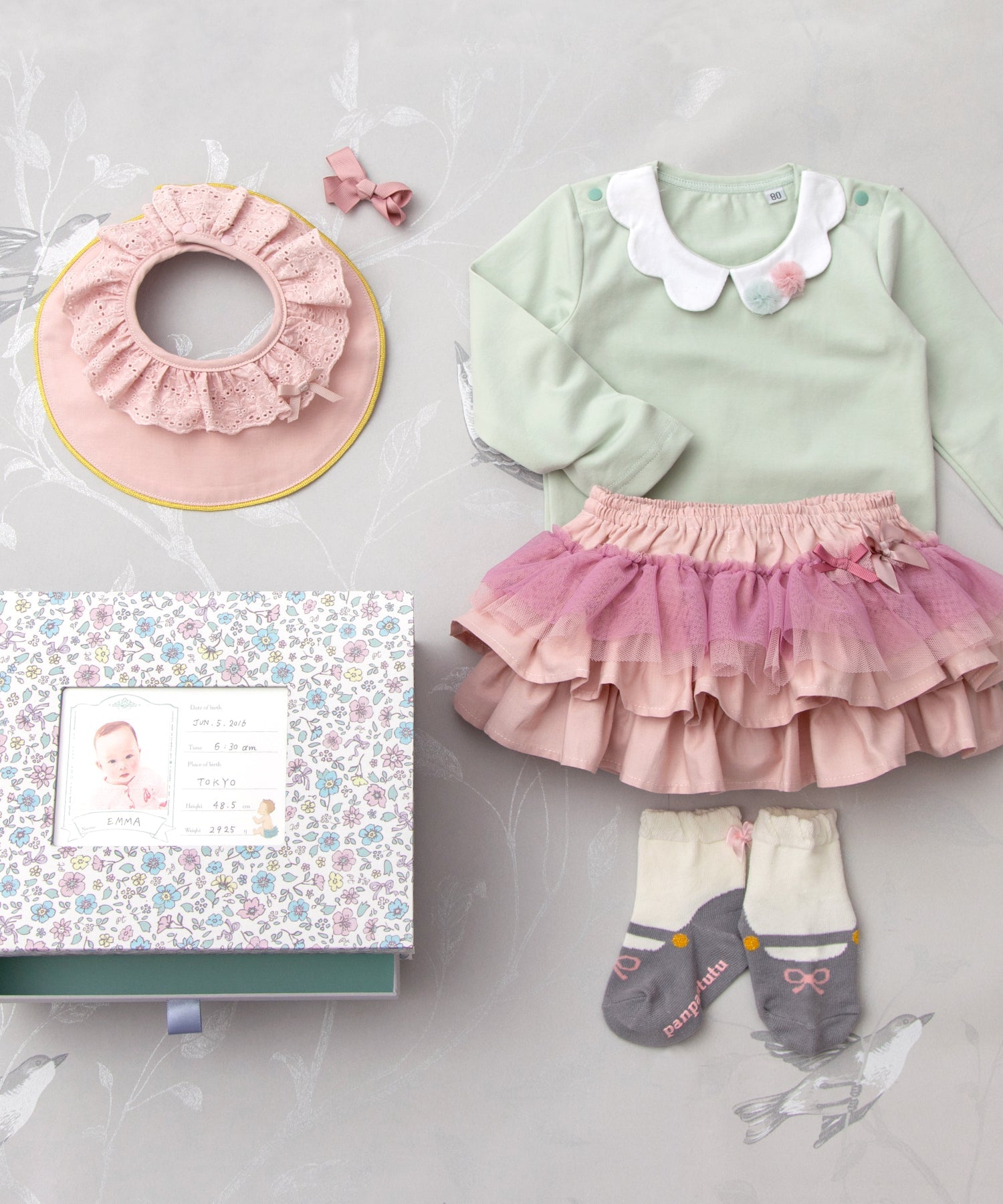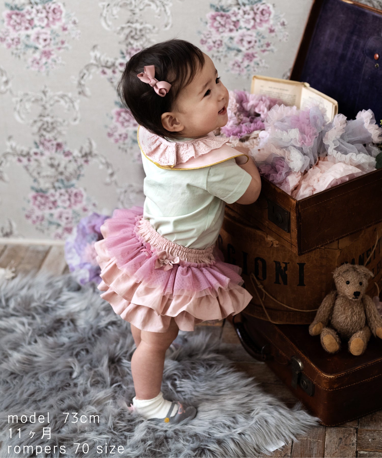 天使のようなえりがポイントになったロンパース。ビブ、フリフリボトムはベビーから2歳頃の長い月齢で着用できます。靴を履いているようなソックスもセット。仕上げのリボンヘアピンをつけたらスウィートコーデの完成!着回しで普段使いはもちろん、セットアップ風で特別な日に。