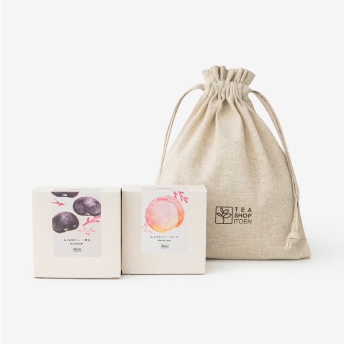 オリジナルラッピング巾着に包まれたルイボスティー2種セット。