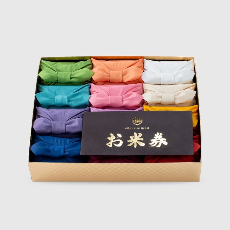 12種類のお米のギフト「満開」とお米券3枚のギフト。極上のお米のおいしさとお気に入りを選ぶ楽しさが、2度嬉しい。感謝と思いやりの心を込めた贈りものです