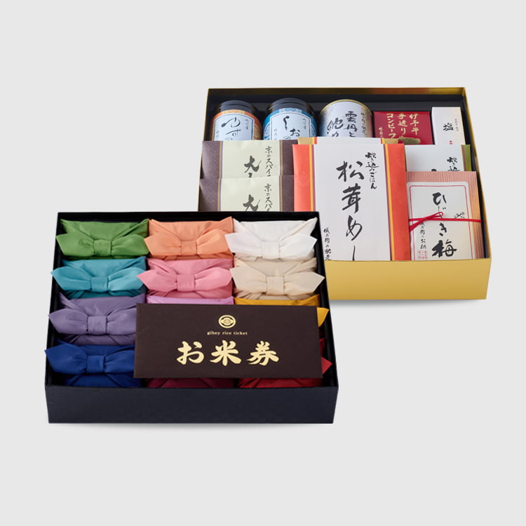 十二単お供詰合せ「瑠璃」と、お米券2枚のギフト。極上のお米のおいしさとお気に入りを選ぶ楽しさが、二度嬉しい。感謝と思いやりの心を込めた贈りものです