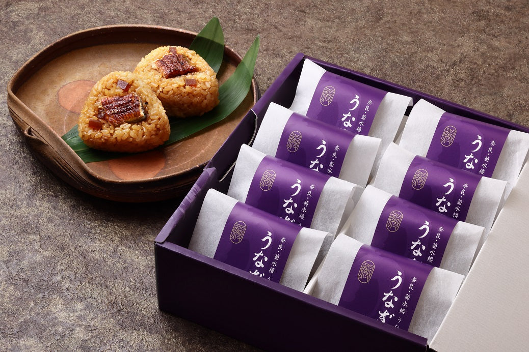 鰻屋が厳選した国産(静岡・鹿児島県産)うなぎを蒸してからタレで焼き上げた「蒲焼」、香り高い最高級「山椒」、鰻との相性抜群の奈良名産 慶応3年創業いせ弥「奈良漬」、そして職人の手仕事でガス火で炊き上げた国産コシヒカリにうな菊秘伝のうなぎのタレをまぶしたおにぎりです。