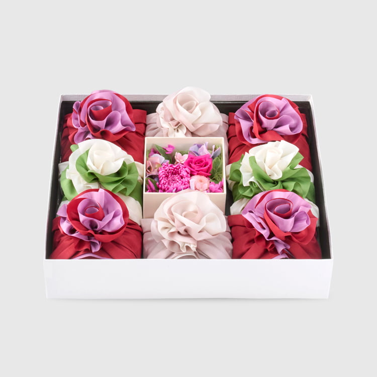 美しさとおいしさを兼ね備えた、八代目儀兵衛×日比谷花壇のコラボレーションギフト。五感で味わう、おもてなしの詰合せです。日比谷花壇が手掛けるピンクの濃淡でアレンジしたフラワーボックスと、人気の料理米をセットにしました。