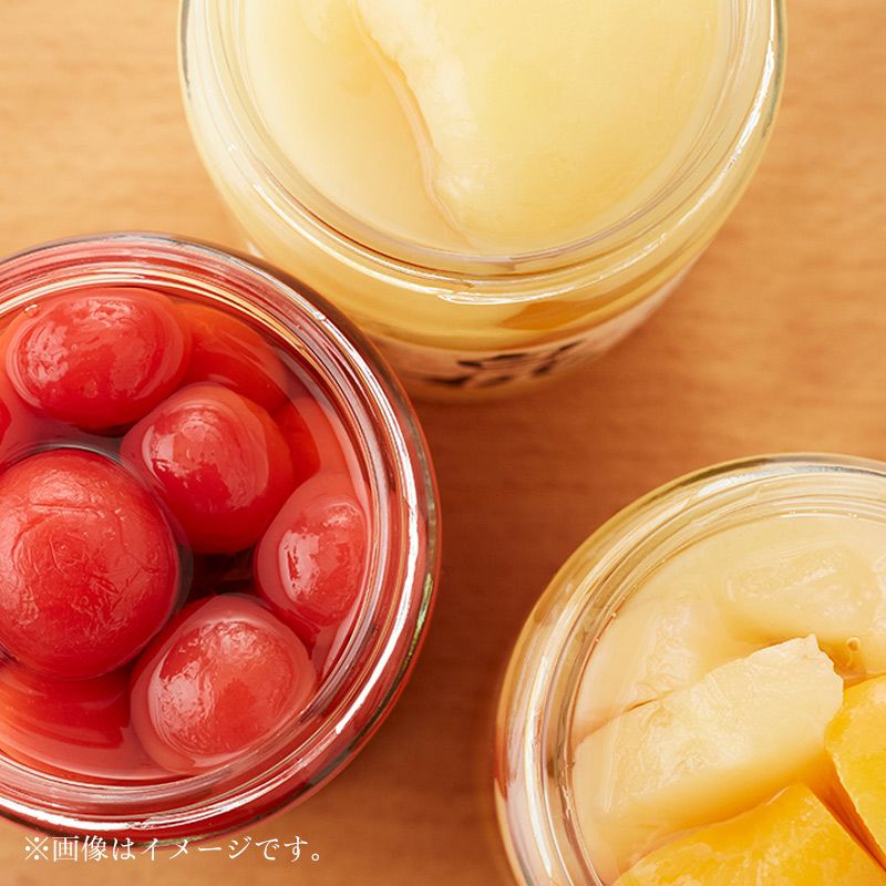 果実のおいしさが味わえるよう甘さ控えめのシロップに漬け込み、手作業でひとつひとつ丁寧に瓶に詰めています。杏仁豆腐の中には、杏仁豆腐、黄桃、りんご、パイン、みかんが入っています。