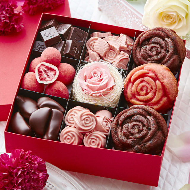 それぞれに個性豊かな7種のスイーツとローズのプリザーブドフラワーが美しく並んだ、宝石箱のようなスペシャルギフトです。