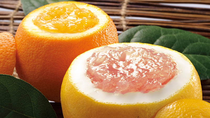 千疋屋が厳選した果実をまるごとくりぬき、絞りたての果汁を余さず使用。果実の器に注ぎ込んでゼリーに仕上げました。
