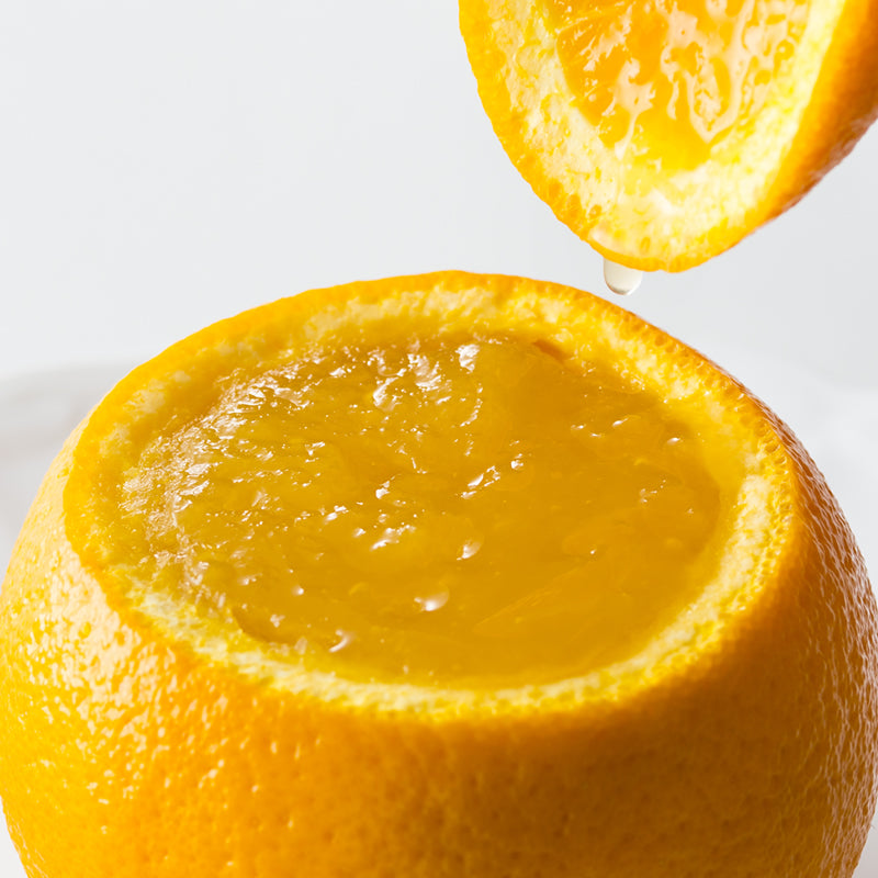 果皮で出来ている蓋の部分に果肉を残していますので、フレッシュな果汁を仕上げとしてゼリーに絞りかけてお召し上がり頂くと、さらにフレッシュさをご堪能いただけます。