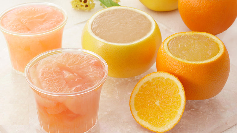 新鮮なグレープフルーツとオレンジの果汁を余すところなく、ゼリーとシロップ漬けに仕上げました。最後までこだわりぬいた、「果汁を感じる」仕上がり。