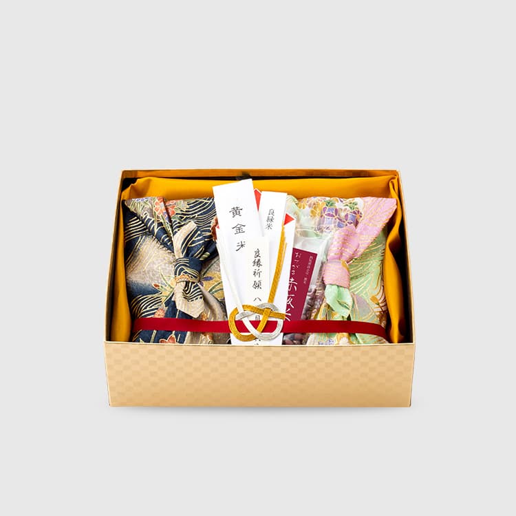華やかに想いを包んだ 贈りもの ご縁や感謝を、金彩友禅で丁寧に包まれたお米にこめて。「殿米」「姫米」をかけあわせると、さらに奥深い味わいへ。門出にふさわしい詰合せ。