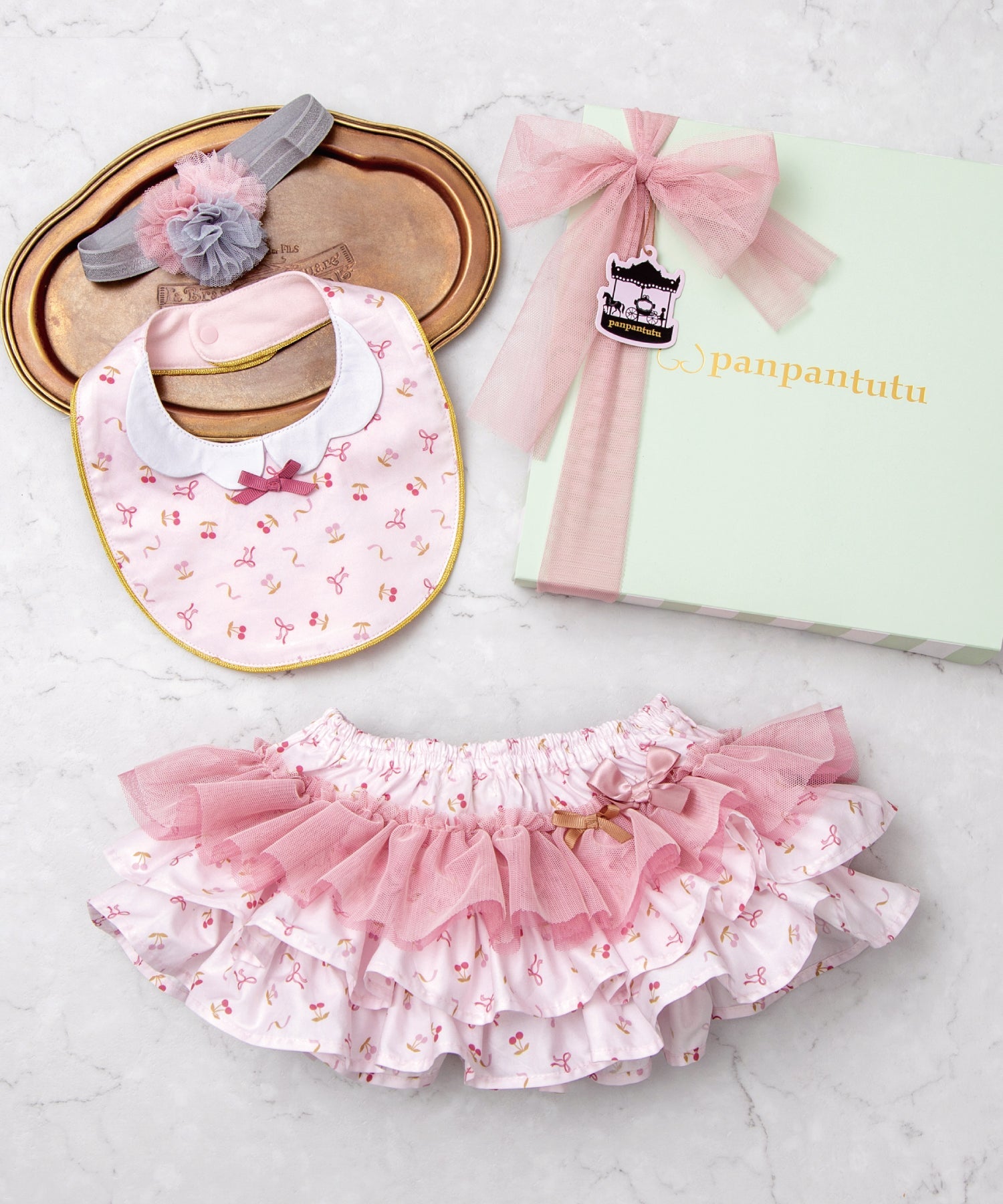 360度どこから見てもふわふわキュートなフリフリボトム。お揃いのビブ、靴を履いているようなソックスもセット。リボンヘアピンをつけたら、スイートベビーの完成!