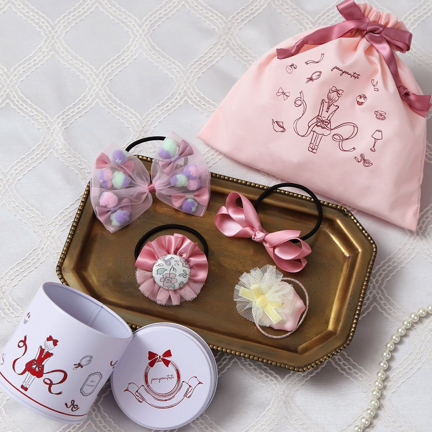 女の子の可愛いお部屋がプリントされたプチジュエル缶に、リボンがいっぱい入った夢のようなプチ缶ギフト。