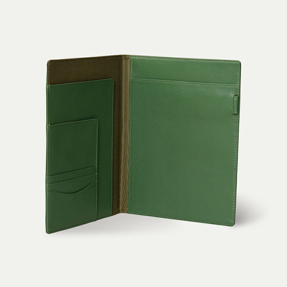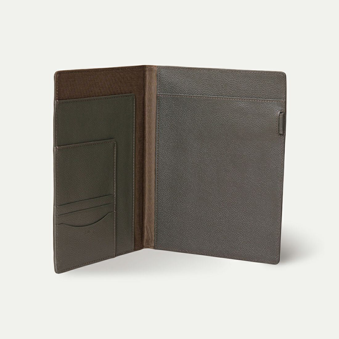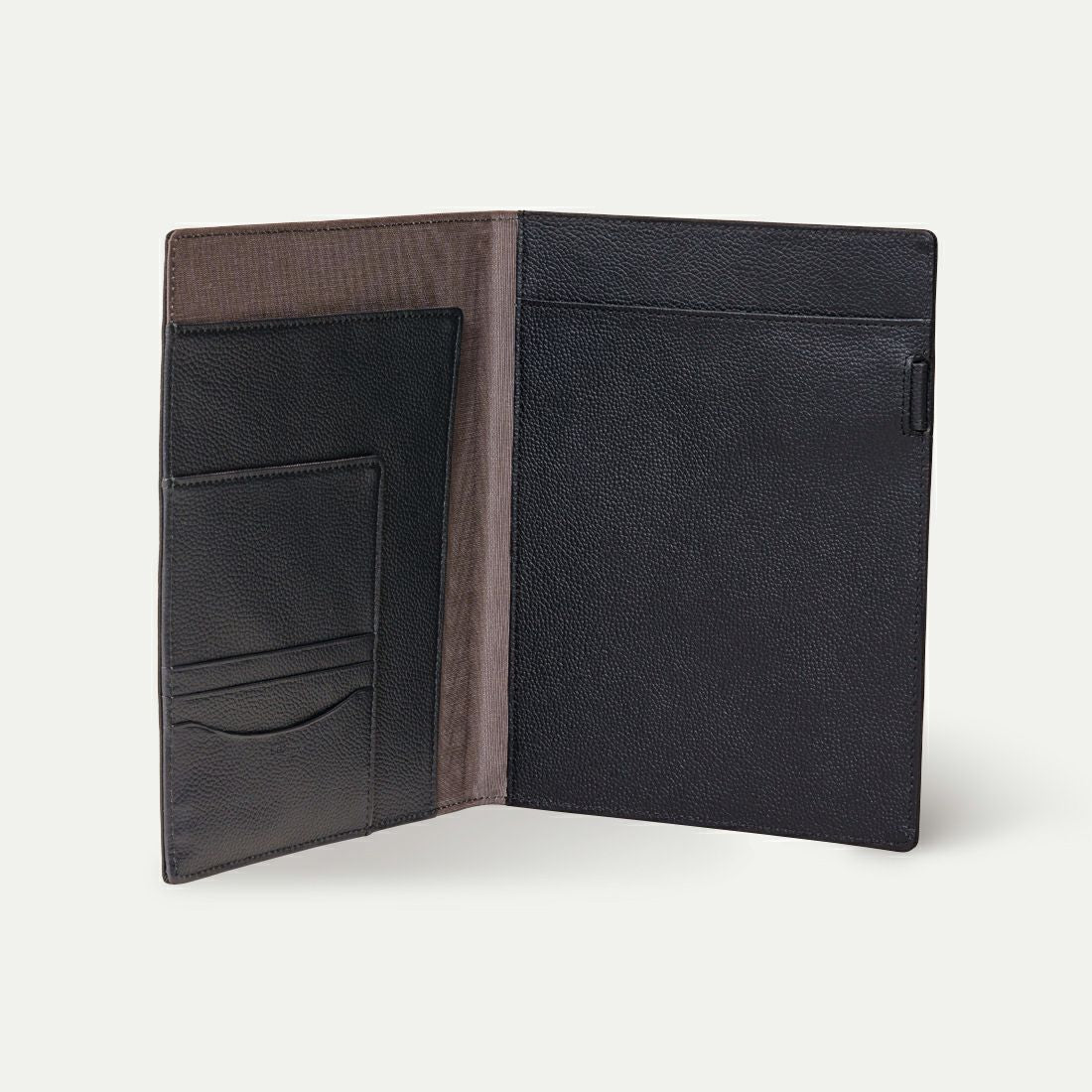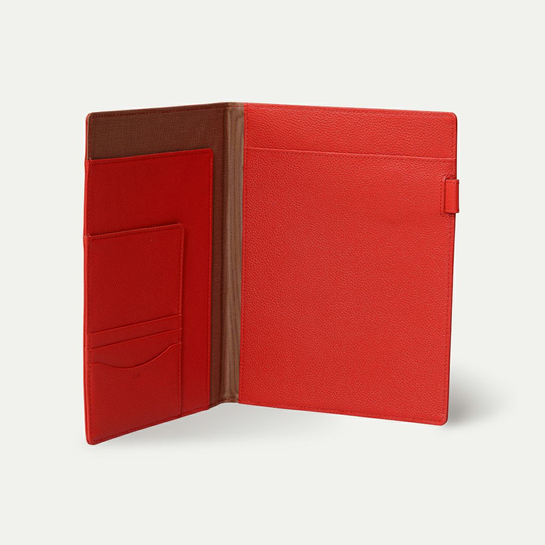 ロディアNo.16サイズに対応の本革メモカバー。カードや名刺を挟んでおけるカードポケット、切り取ったメモを挟むジョッターを用意しています。