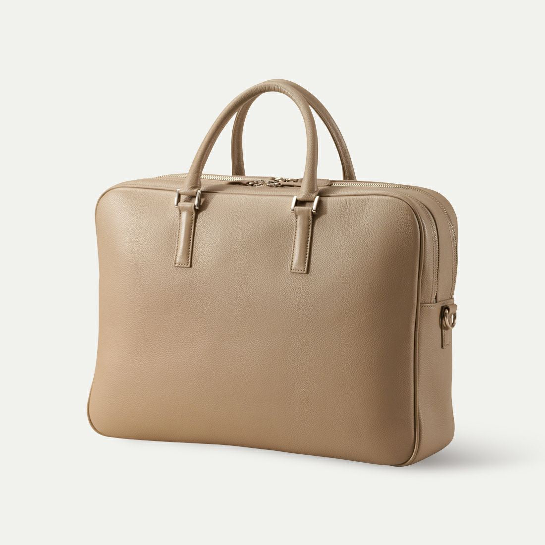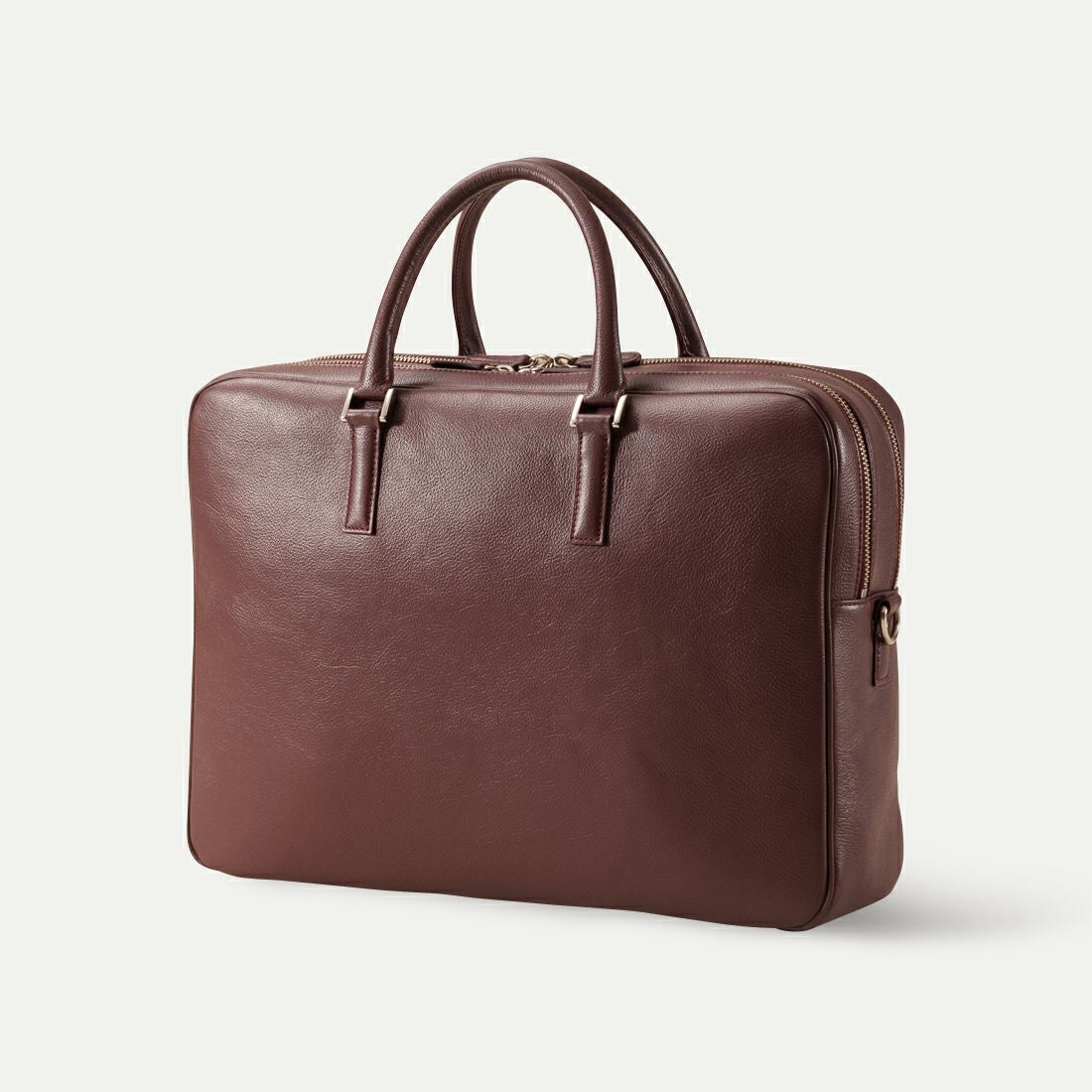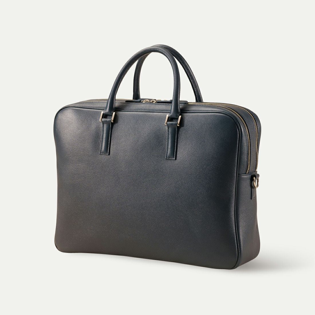 大容量でも形の美しさにこだわったシルエット。メイン収納は大きな2気質タイプになっています。商談用の書類やパソコンと出張用の着替え、お弁当などを分けて収納可能です。15インチまでのノートPCも収納できる大きさです。