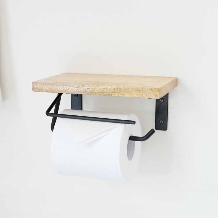 また、天然素材のため木目や色味に個体差がございます。 トイレットペーパーホルダーには、ウッド素材のシェルフ付き。
