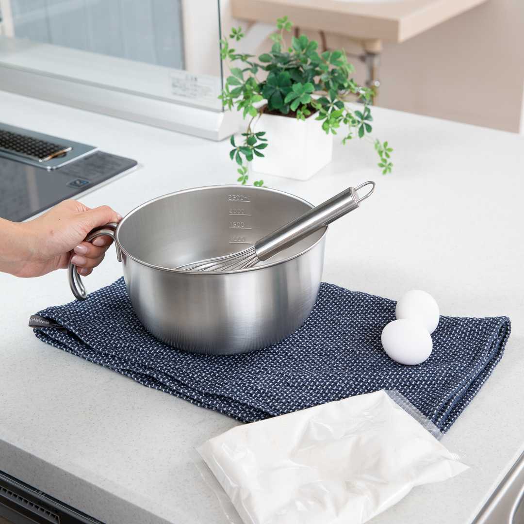 一見シンプルに見えるこちらのボウル、取っ手がついている優れものなんです。取っ手がついているボウルは、毎日の料理や冷蔵庫に入れるときなどとても便利です。安定して持つことができるので、ひっくり返って中身がこぼれてしまうといったこともなく使用できます。ちょっと深めに作られているので、調理しているときにうっかりこぼしてしまうという心配もないんです。ボウルは、ドレッシングやサラダを混ぜるとき、お菓子の材料を混ぜるときなど、いろいろなシーンで大活躍します。どこを持って混ぜようか悩んだり、長く混ぜていることで疲れてしまうことの多いボウル、これならそんな煩わしさを感じずに使い続けることができるんです。取っ手がついているおかげで、手や腕に負担がかかりにくく食材を混ぜることができます。混ぜたりこねたり、注いだり、いろんな動作が快適にできますよ。ボウルの淵をよく見ると、片側に注ぎ口が付いています。出来上がったドレッシングを注いだり、ホットケーキミックスをホットプレートに注いだりといった動作がスムーズにできます。淵に沿って中身が垂れてきてしまう心配もないので、ボウルをきれいに使えるのも嬉しいポイントです。注ぎ口を活用して、料理を楽しんでみてください。洗いやすく汚れが取れやすいステンレス製のボウル、内側を見ると目盛りも付いています。500ml~2500mlまで500刻みで計量できるようになっているので、計りながら料理をしたいときにも便利です。お菓子づくりのときにも、目盛りが大活躍しそうですね。目盛り部分は見えやすくなっているので、計量カップ代わりとして活用できます。見た目がすっきりと見えるコンパクトなボウル、大容量なのでたっぷり料理を作りたいときにも活躍します。片づけるときは他のボウルと重ねて収納することもでき、キッチンをシンプルに片づけておくことができるんです。女性目線で作られたこのボウル、女性の手にとって持ちやすく、どんな雰囲気のキッチンにも馴染むデザインに仕上がっています。【商品に関して】サイズ:約 幅20×奥行26.8×高さ11.3cm 重量:約430g 素材:18-8ステンレス 内容量:約3L 原産国:日本 【お取り扱いに関して】食器洗い乾燥機可 ※製品を火にかけないでください。※電子レンジやオーブン、IH、電熱器等で使用しないでください。