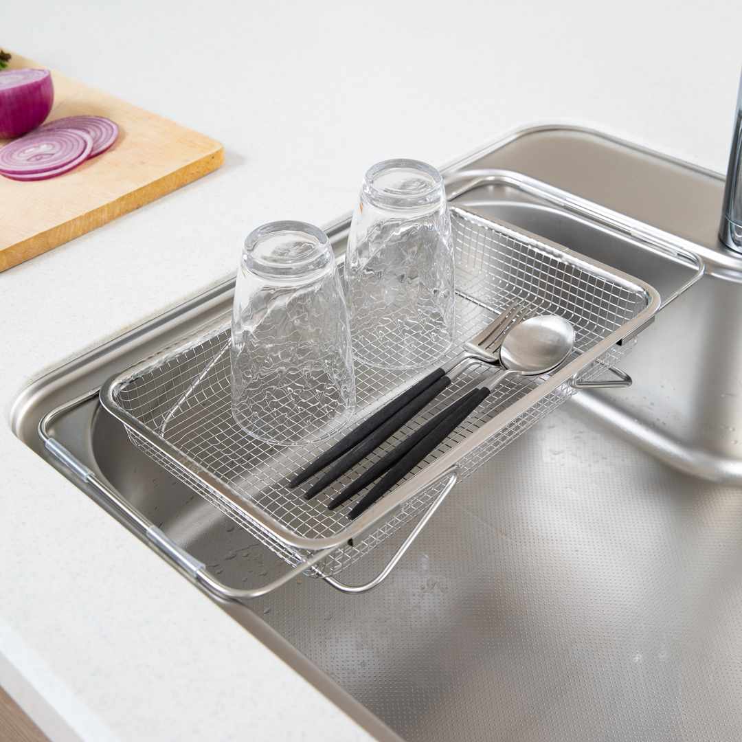 シンクの中と外、どちらにも使用できる水切りカゴ。キッチンのシンクでは、食器や調理器具を乾かしたり、食材を一時的に置いておくなどのスペースがあると便利です。いろいろな用途に使用できるアイテムを持っておくと、毎日の料理や洗い物などもはかどるでしょう。そこで登場したのが、こちらの水切りかごです。シンクの中と外、どちらにも設置ができるようになっているので、使うシーンに合わせて調節ができるんです。食器などを置くことも多い水切りかご、安定感にも注目したいです。そこで、スタンドとして使用できる部分にシリコンゴムの滑り止めをつけました。この滑り止めのおかげで安定して置くことができ、キッチンを傷つけずに済みます。うっかり水切りかごごとひっくり返ってしまうといった事態を避けられるので、安心して使うことができますよ。水切りかごは、濡れたものをそのまま置いて自然乾燥する際に便利なアイテムです。その乾かしたいもののなかには、カトラリーや水筒のパーツなどといった細かいものもあるでしょう。うっかり隙間から落ちてしまうことも想定されます。そこで、この水切りかごは一般的なものより網目を細かくしました。細かいものや小さなものも落とすことなく、快適に使用できます。必要のないときは片づけておきたい、そんなときにもすっきり収納できるのが魅力となっています。伸縮バーを縮めてV字型にすることで、カゴが自立するようになりました。 幅が6cmほどあれば立てておくことができるので、キッチンのスペースが限られている場合にも安心です。いろいろなご家庭のシンクやキッチンで使用してもらえるよう、水切りかごのバーが伸縮する仕様になっているのもポイントです。購入する際は、対応シンクのサイズをしっかりと確認しておきましょう。伸縮バーを縮めると、スタンドを使って天板の上などで自立させることができます。使い勝手抜群で、シンクに合わせて使用できる点が魅力的です。【商品に関して】サイズ:約 幅20.4× 奥行31.5~49.2×高さ6cm かご内寸:約 幅18.5×奥行29.5×4cm 重量:約370g 素材:本体:ステンレス鋼(クロム18%、ニッケル8%)/すべり止めゴム:シリコーンゴム 耐荷重:2kg(バスケット) 原産国:日本 【お取り扱いに関して】対応シンク奥行サイズ: 32~45cm 食器洗い乾燥機使用可