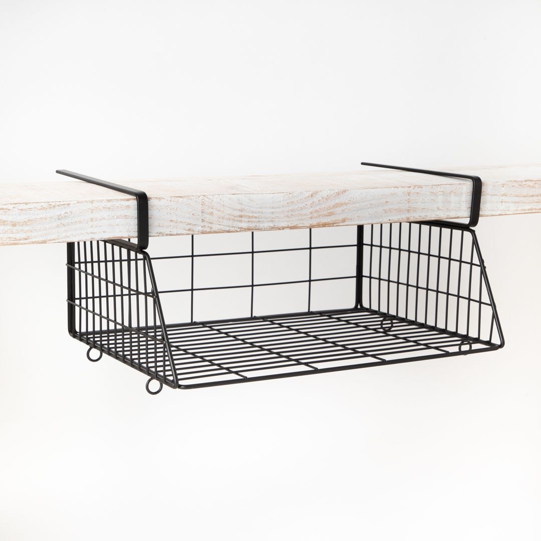 ブラックのアイアンバスケットは空間をキリッとしめてくれる効果もあり、お落なインテリア性と、収納の実用性を兼ね備えた万能アイテムです。                     上部のフックを棚などに差し込むだけで簡単に設置が完了。厚さ最大4.5cmまでの棚板にご使用いただけます。今ある棚にさっと差し込むだけなので、壁に穴を開けることの難しい賃貸マンションなどにお住いの方にはオススメのアイテムです。工具も不要で誰でも手軽に設置できるのが嬉しいですね。