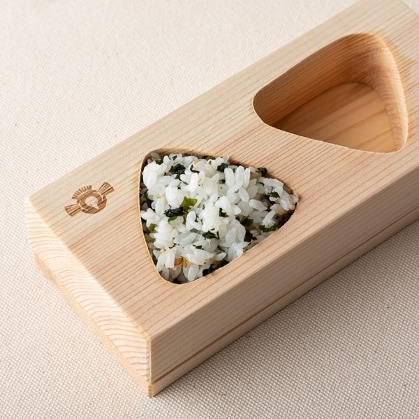 ヒノキの木の型が余分な水分を吸収し、ご飯をより理想的な味にします。美味しく炊けたご飯も水蒸気のある状態でそのままにしておくと、しだいに粘りを失い、ナマの状態にもどっていきます。この現象は米の澱粉の老化によるもの。木の型を使うことで、それを防いでくれます。また、出来上がったおにぎりにはヒノキの香りがほんのり移り、食欲をそそるものに。