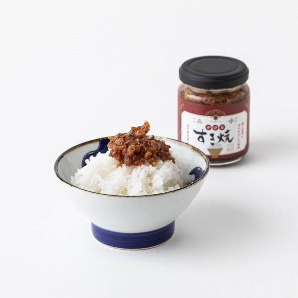 甘辛い醤油ベースのタレに、すき焼きの定番具材の、牛肉・ねぎ・白菜がごろっと入ったごはんのおとも。卵かけご飯にそえて「すき焼き丼風」に。
