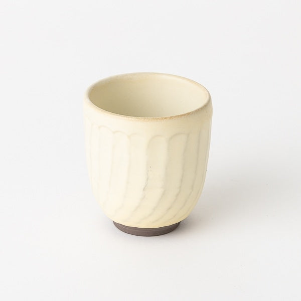 ぽってりとしたフォルムににシノギを入れて締まったデザインに仕上げた湯のみ。