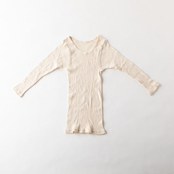 国内有数のニット産地である和歌山にあるメリヤス工場で作られています。ふんわりとやわらかく伸縮性があるリブ編みの生地がやさしくフィットし、脇縫製の無い丸編みなので肌あたりもストレスなく抜群の着心地。