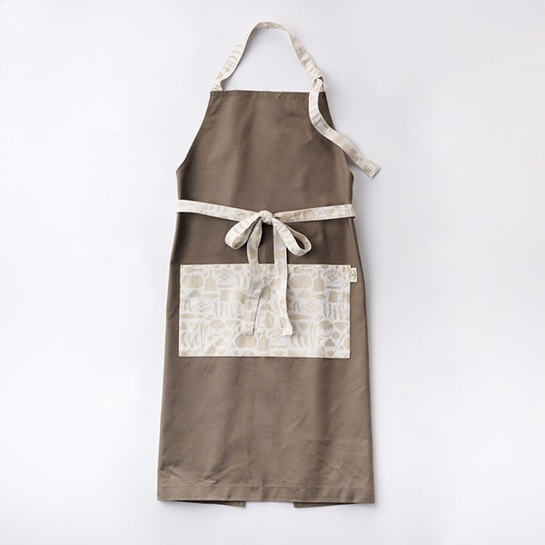 柄の部分には、先染め生地の有名な産地である兵庫県播州地方で別注生産をしたブランドオリジナルのコットンジャガード素材を使用したエプロン。