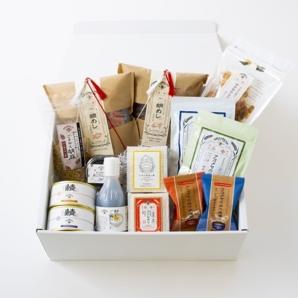 アコメヤ最大の魅力、”ご飯のお供の多さ”を体感してほしい!そんな想いを込めました。お米二種は、そのままでも美味しく甘みのあるお米です。 また、鯛めしは身もふっくらしていて、優しい味付け。贈り物にもピッタリです!