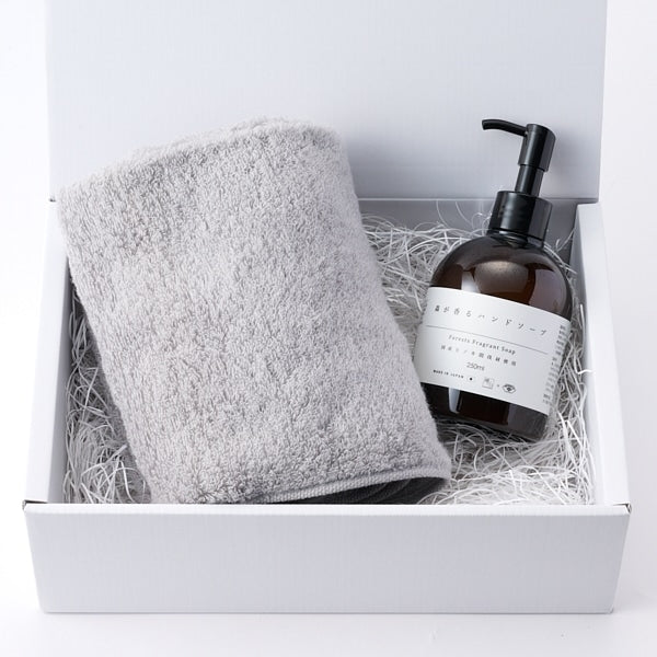 AKOMEYA TOKYOオリジナルの天然ヒノキだけで香り付けしたハンドソープと、今治産のフェイスタオルのギフトセット。ヒノキの香りのハンドソープは、深呼吸をすれば、森林浴のような清々しい気分に。日々の手を洗う習慣が、心安らぐリフレッシュタイムに変わります。