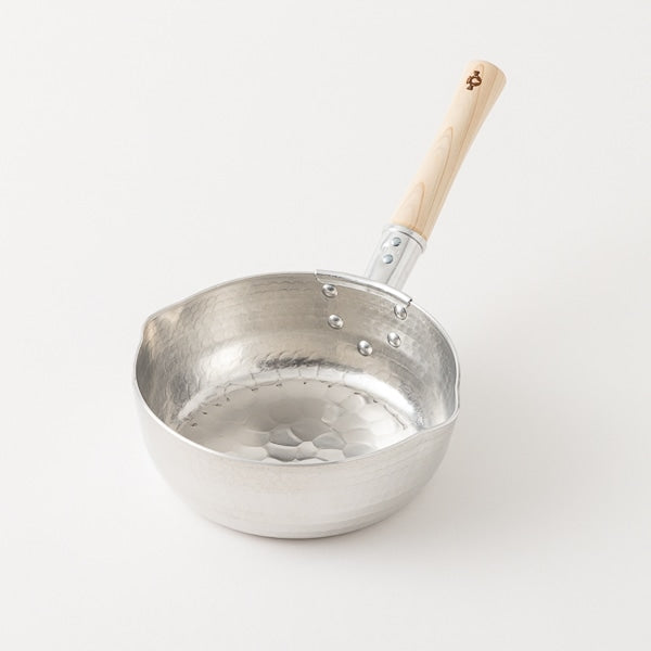 中村銅器のアルミ行平鍋の魅力は、板厚2.0mmのアルミ板を手作業で槌目打ちを施し、軽さと丈夫さを持ち合わせ、実用性に優れた行平鍋であること。