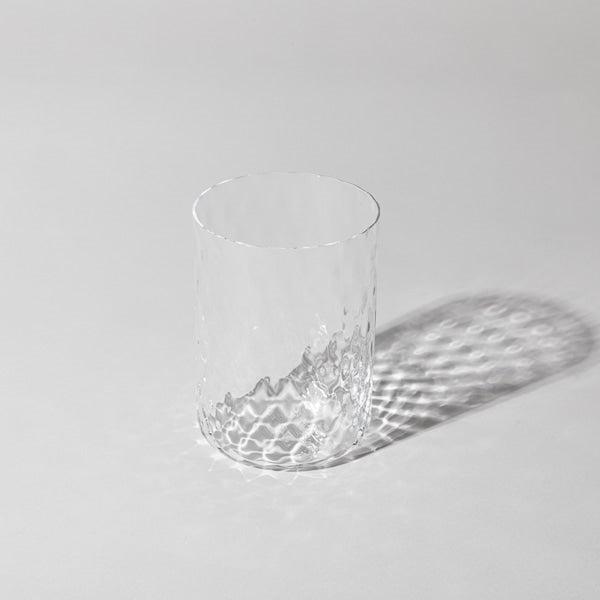 こちらのグラスは、飲み物を入れて光にかざすときらきらと水面のような輝きを放つチェック柄をあしらったデザイン。