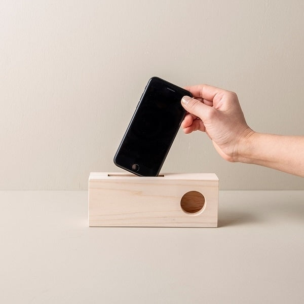 上部の切り込み部分にスマホを差し込み、通常通り音楽を流してください。温かみのある音が広がります。音楽はもちろん、ラジオを聞く際にもご利用ください。