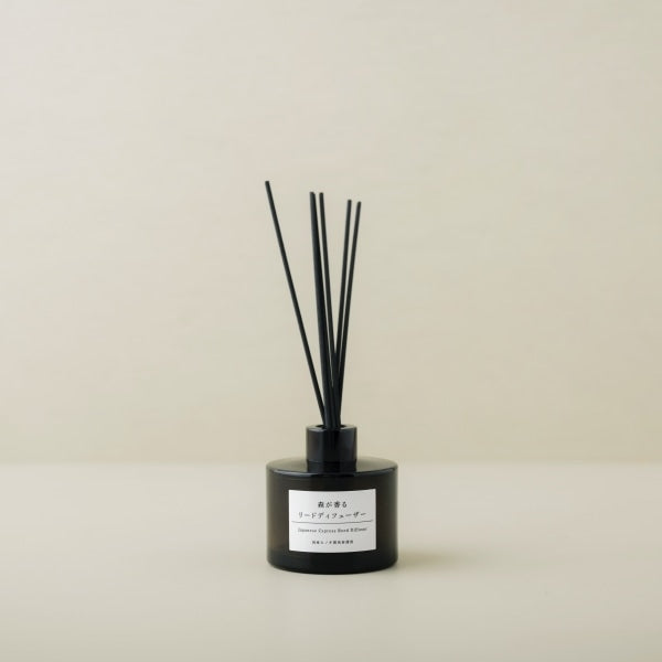 天然ヒノキの間伐材から抽出した精油を使用したディフューザー。リード(スティック)を差すだけで、お部屋が森林のようなヒノキの香りに包まれます。消臭効果もあるので、玄関先やリビング、お手洗いなど香りの気になるところに置くのもおすすめです。