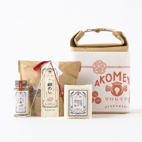 「長野県中野市産 風さやか」に、海の恵みを味わえる「炊き込みごはんの素 鯛めし 2合炊き用」と「アコメヤのだし塩 かつお」をセットにしました。