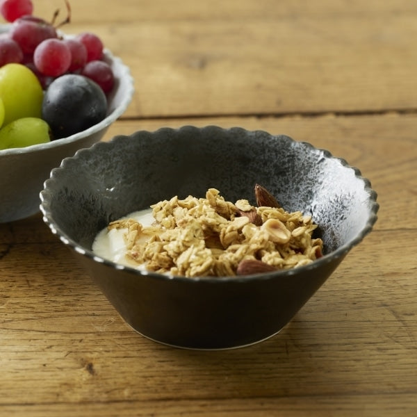 シックなモノトーンですが、釉薬をランダムに散らすことで、奥行きのある表情となり、水滴にも見える釉薬が食材に瑞々しい印象を与えてくれます。ベーシックな黒、白に加え、アコメヤのために色出ししていただいた限定色グレーの3色展開。フリルをイメージした渕の波の曲線がシックな中にも可愛さを演出してくれます。シンプルなデザインとカラー展開なので和洋問わずに使いやすくデイリーに活躍します。型違い、サイズ違いで揃えておくとテーブルに統一感が生まれます。