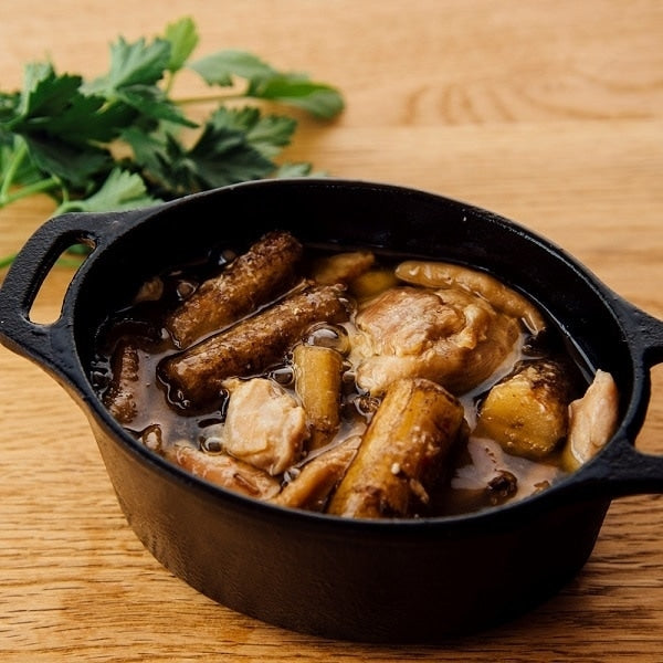 大分県産の冠地どりと、国産のごぼうとにんにくを使用したアヒージョ。オリーブオイルとにんにく、唐辛子でコク深い味わいに仕上げました。パスタやバゲットに合わせてもお楽しみいただけます。