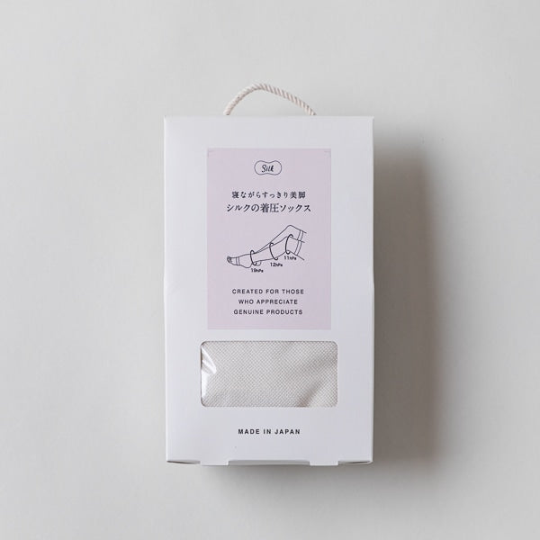なめらかで肌触りの良いシルクをつかった着圧オーバーニーソックス。ほどよい段階着圧が脚を心地よくサポートします。就寝時や旅行等で脚が疲れやすい時にもおすすめです。