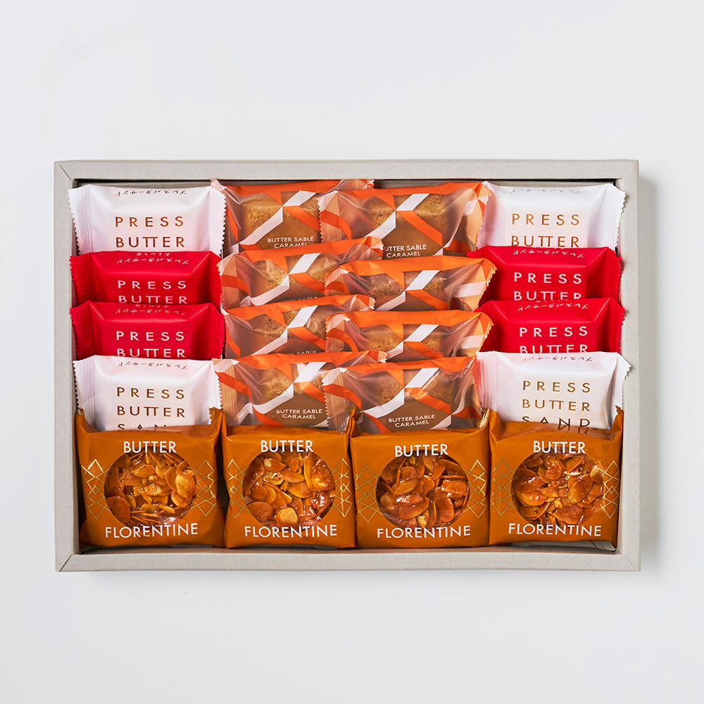 代表商品のバターサンドと人気の〈あまおう苺〉、バターをたっぷり使ったサブレ生地の中に焦がしキャラメルを入れたバターサブレ、バターを染み出すほどたっぷり使用したタルトカップにオレンジがアクセントの濃厚キャラメルとカリカリスライスアーモンドをトッピングしたバターフロランタンの詰合せ。バターとキャラメルの濃厚なコクをご堪能いただけます。