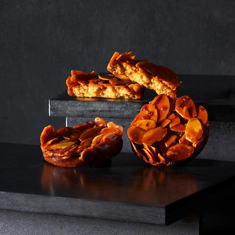 美味しさの秘訣は、濃厚キャラメルとバタータルトがもたらす奥深い味わい。タルトカップの底にしみ出すほどたっぷり使ったバターが生み出す生地のほろほろ感と、香ばしく焼き上げたスライスアーモンドのカリカリ感、ふたつの食感も特長です。生地に入れたマダガスカル産バニラビーンズを使用したペーストと、キャラメルに入れたオレンジゼスト(皮のすりおろし)がもたらす華やかで爽やかな後味とともに、お楽しみください。