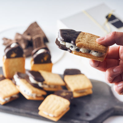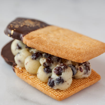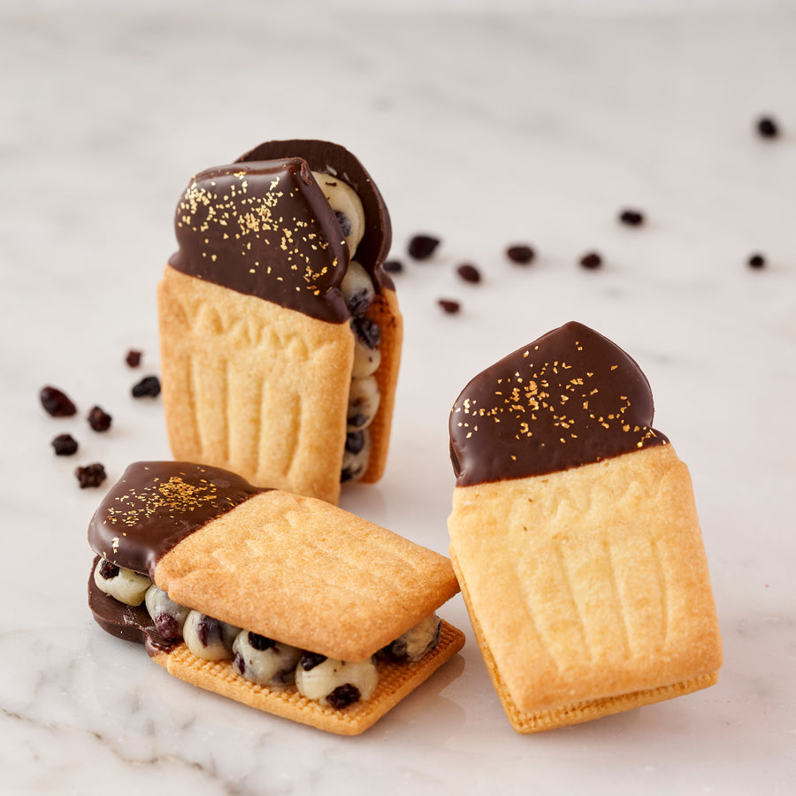 口の中でとろりとやさしく溶け合う、ジュワッとフルーティーなレーズン生バタークリーム。生クリーム入りのバタークリームは驚くほど口どけがなめらか。ホイップしたバターに生クリームを加えた贅沢なクリームと、紅茶に漬け込んだ風味豊かなレーズンを、1枚1枚丁寧に焼き上げたビスケットで挟んだ、重厚感たっぷりの贅沢な味わい。