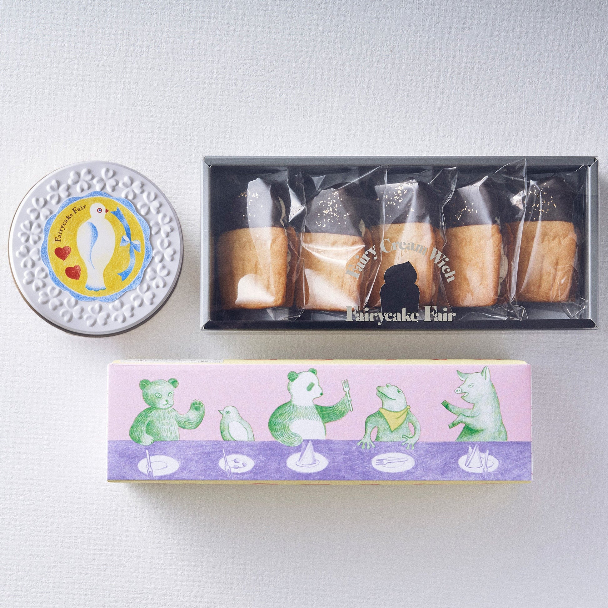 贈り物に人気のバターサンド「フェアリークリームウィッチレーズン生バターサンド」に、かわいい動物のデコレーションを施したベイクドカップケーキ「ベイクドZOO」と、小麦とバター、風味とコクを楽しむビスケットと自慢のメレンゲ菓子が入ったビスケット缶シリーズ「プチカドー はとハート」を詰め合わせました