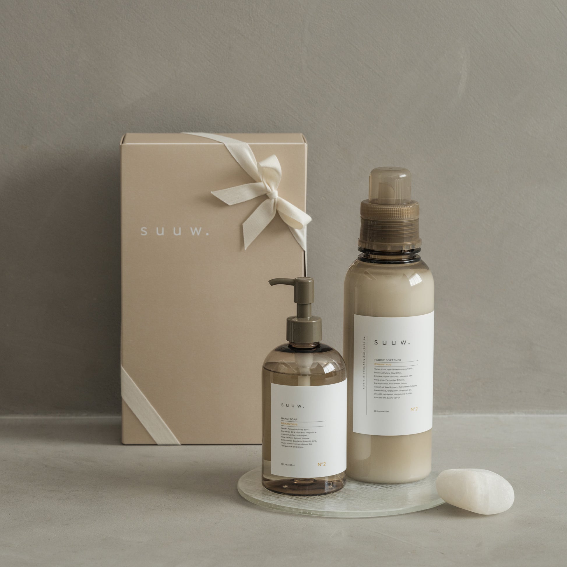 植物由来のフレグランスブランド「suuw.」による、柔軟剤・ハンドソープのギフトセット。