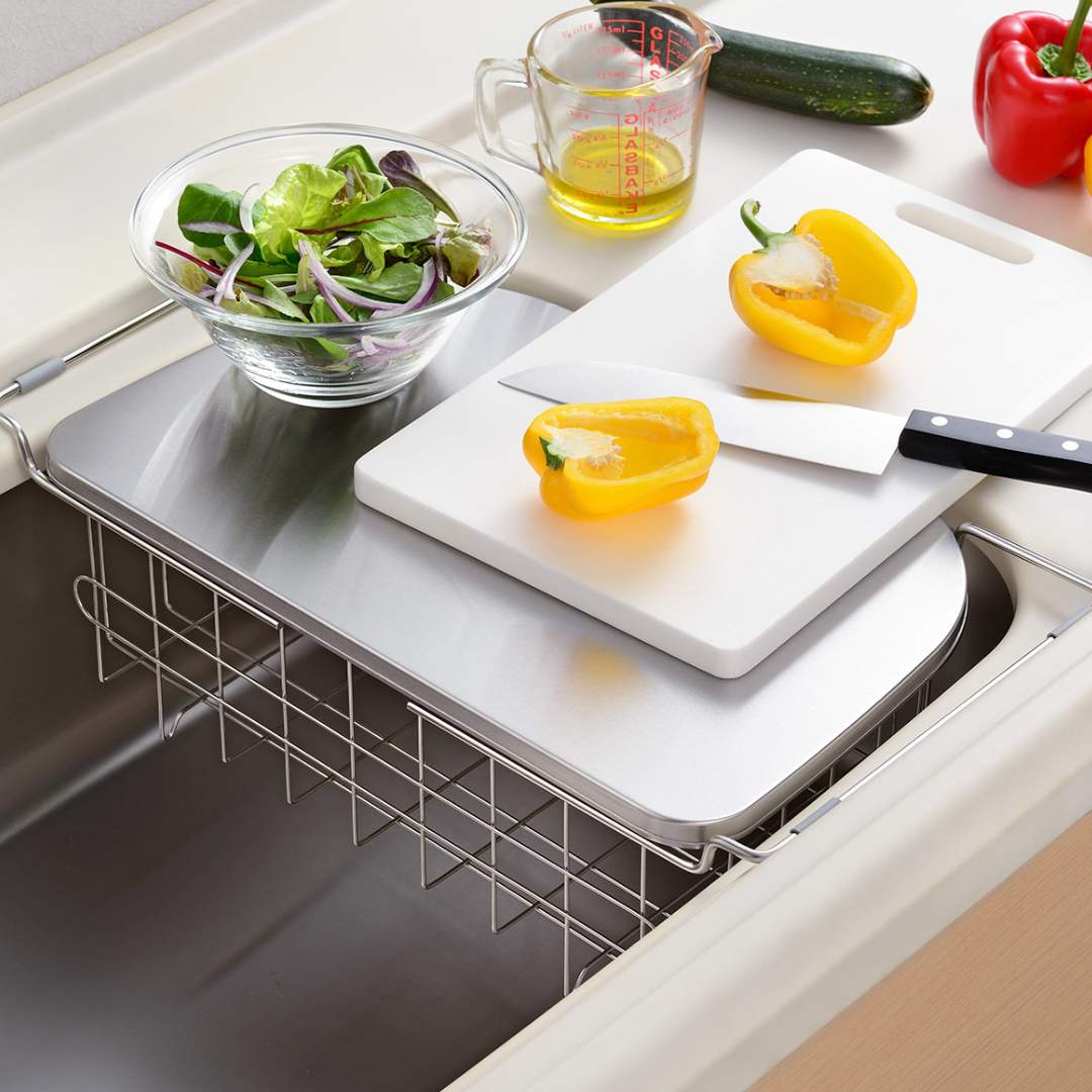 シンクに設置すれば、キッチンの調理スペースを拡大できるトレー&水切りです。調理スペースが狭いと、スムーズな料理作りは一苦労。このトレーをシンクの上に置くだけで、キッチンカウンターが延長されたように広々使うことが可能になります。次に使う食材やキッチンツールを置いたり、できた料理を盛り付ける場所にしたりと、スペースの使い方は自由。さらに、トレーの下には水切りカゴが付いているので、洗った食器や野菜の水切り場所にすることもできます。シンク内を広く使いたいときは、トレーを受け皿にして水切りカゴをキッチンカウンターに置けるのが◎。サビや汚れに強く、衛生面の管理がしやすいステンレス製なのもうれしいポイントです。【商品に関して】サイズ:約幅25.5×奥行45.2×高さ13.3cm(すべりどめゴム部含む)トレーサイズ:約幅25.5×奥行39.2cm 重量:約920g 素材:本体:ステンレス鋼(クロム18%、ニッケル8%) トレー:ステンレス鋼(クロム18%) すべりどめゴム:合成ゴム 耐荷重:最大積載荷重:7kg 原産国:日本 【お取り扱いに関して】使用可能なシンクの奥行内寸:約41~43.5cm(伸縮しません)