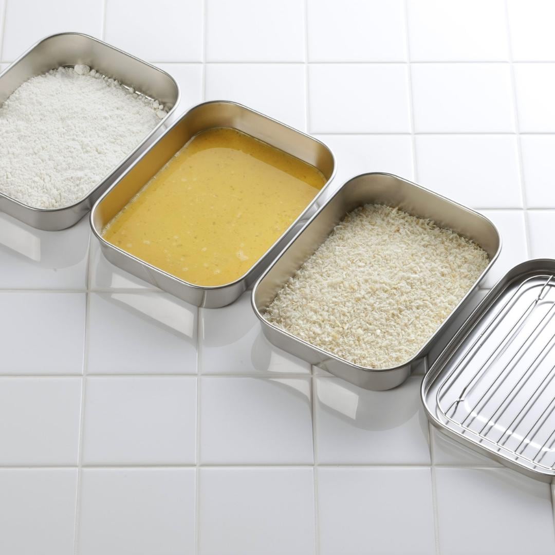 綺麗にスッキリ!作業スペースを散らかさないキッチンバット。ママクックのキッチンバットは、ひとつあるだけで作業スペースや冷蔵庫を散らかさずに料理できるバットです。特徴は、バット・シールフタ・アミ各3個とフタ1個がセットになっていること。これらを活用すれば、毎日の料理が快適になります。例えば、各バットに小麦粉・溶き卵・パン粉をいれてフタにアミを取り付ければ揚げ物の準備は完了です。あれこれ用意する必要はありません。あるいは、下準備を済ませた材料をバットに入れて冷蔵庫で保管しておくこともできます。スタッキングできるため、3つのバットを使っても邪魔になりません。もちろん、収納時はすべてを重ねてコンパクトにまとめられます。気になるバットのサイズは、幅22.2cm×奥行16.8cm×高さ3.6cmです。毎日のお料理が快適になるキッチンバットを使ってみませんか。【商品に関して】 サイズ:(約):バット/22.2×16.8×3.6cm、フタ/22.8×17.7×1.5cm、フタした時の全高/3.8cm、シールフタ/22.4×17.2×0.8cm、アミ/19.8×14.2×0.8cm 素材:材質:バット・フタ・アミ/18-8ステンレス(板厚/バット0.5mm フタ0.4mm)、シールフタ/ポリエチレン樹脂(耐熱60度・耐冷-25度)