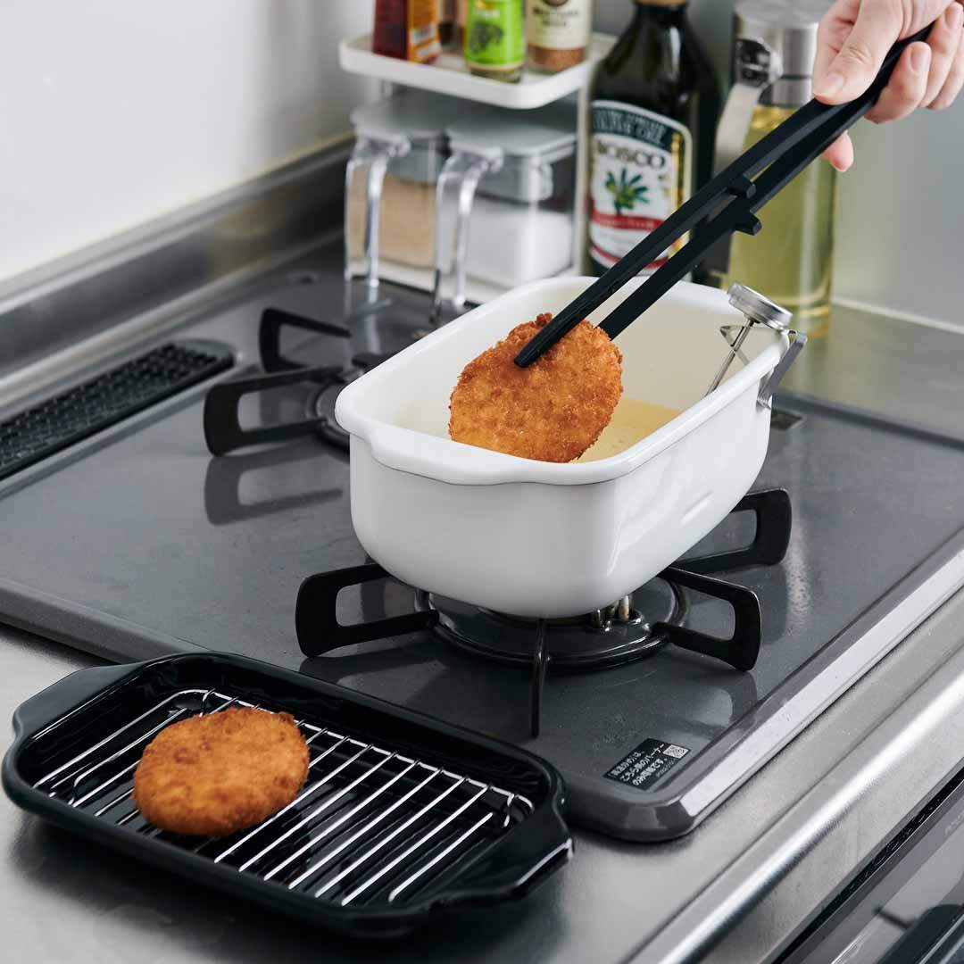 揚げ物のハードルを下げる、横長型コンパクト鍋。コンパクトでスタイリッシュ、充実した付属品が付いた角型タイプの揚げ鍋です。