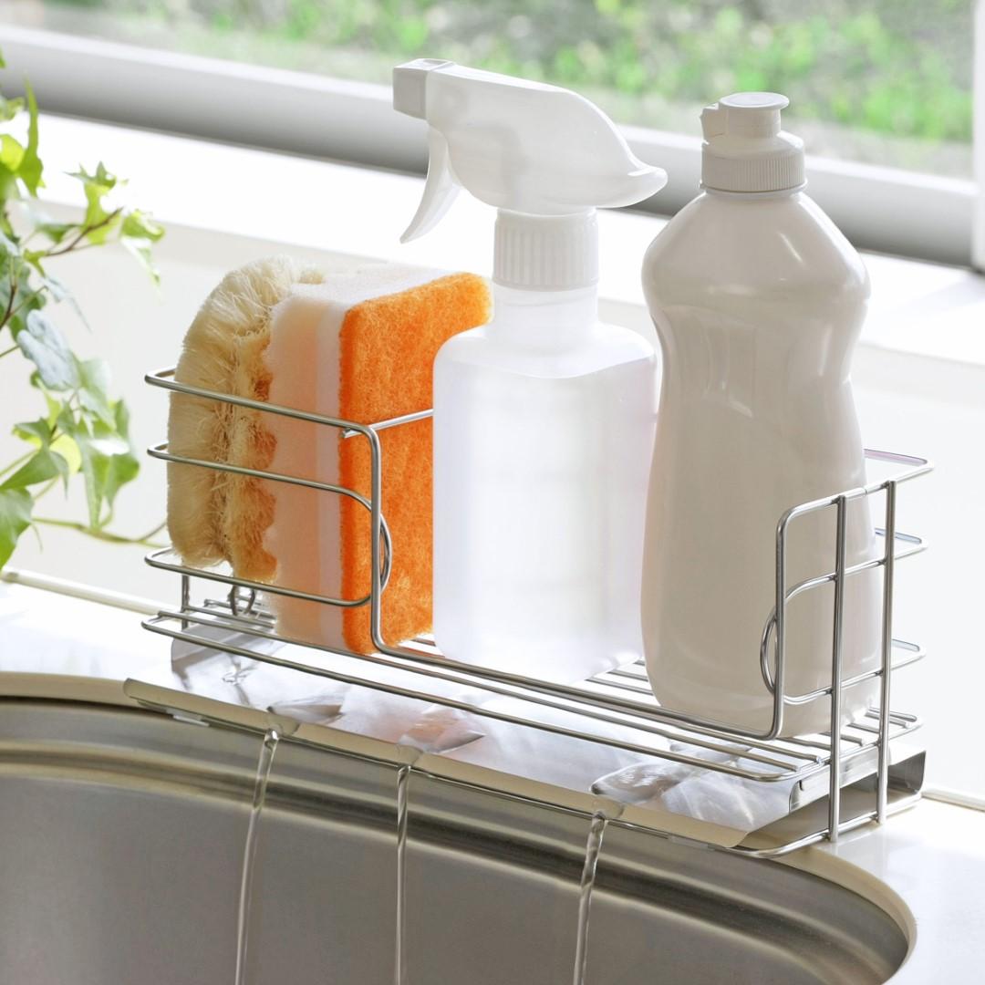 スポンジ・食器用洗剤・たわし・キッチン用アルコールスプレーなど、シンク周りで使う掃除小物をまとめておける収納ラックです。スポンジから滴り落ちる水も自然にシンクに流れ出る斜めトレー付き。水が溜まらず衛生的です。キッチン、洗面所、バスルームなどあらゆる場所でご使用いただけます。
