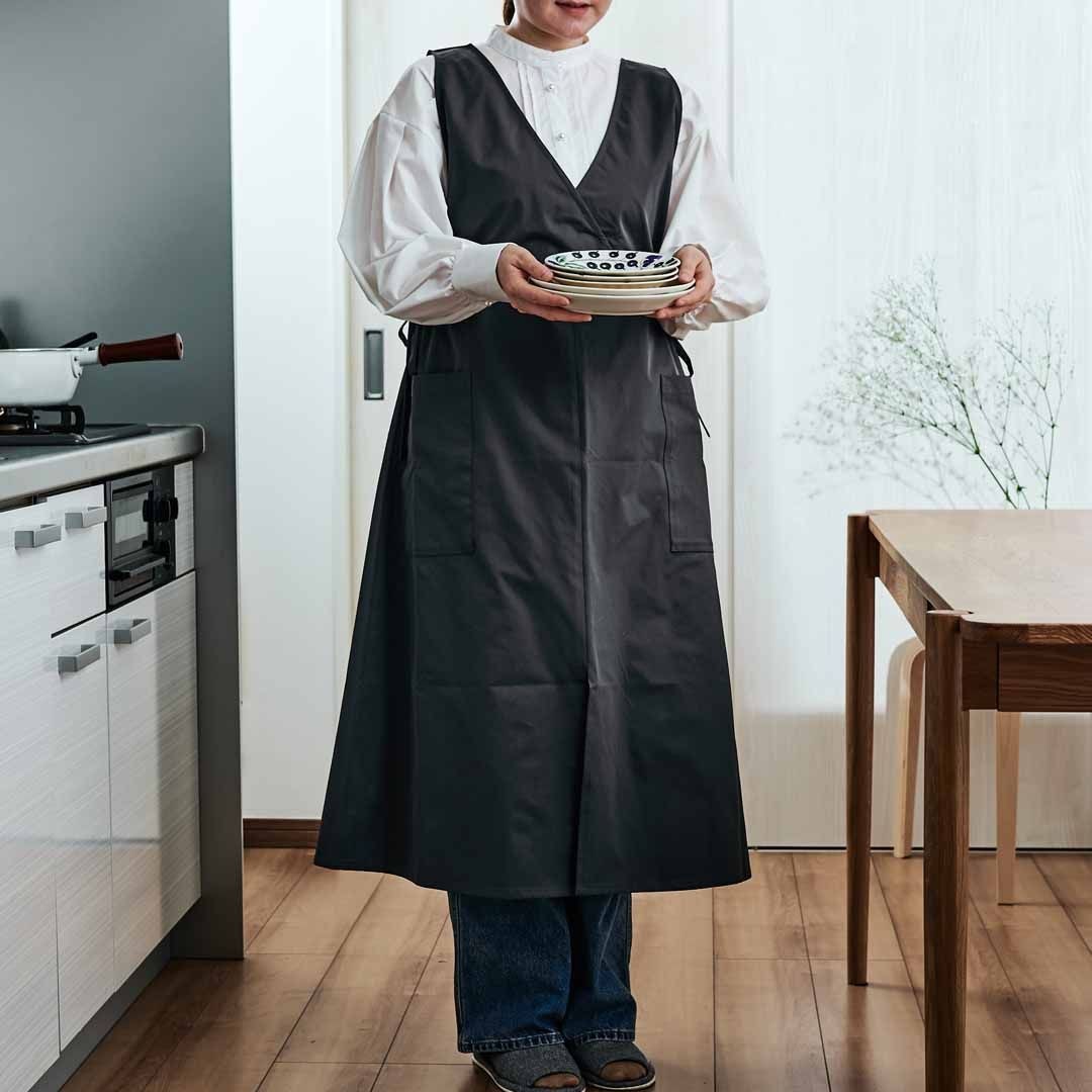 エプロンでもスタイルアップを狙えるので、そのまま着て外出してもエプロンのような印象を与えません。水回りの家事をしているときに水がはねてしまい、思ってる以上にエプロンが濡れてしまうことってありますよね…このエプロンは撥水加工がされているので水回りの家事も楽ちんに。ポリエステル素材なので洗濯の後もシワになりにくく、乾きやすいのが特徴です。                                                                                  【ご使用上の注意】